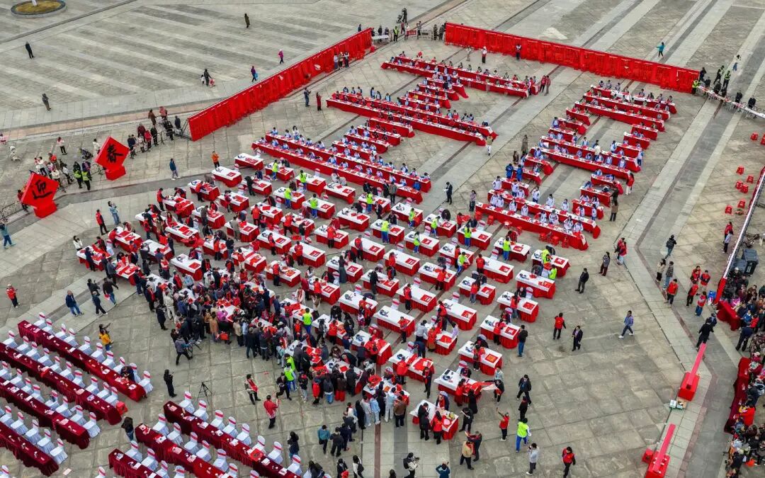 活动现场,巨幅红绸对联高悬而立,联文“国策启鹏程,骏业追风,湾区潮涌千帆竞;瑞气传福字,鸿图织锦,翰墨云联四海春”由马勇明先生撰句、孙晓云先生挥毫书写,笔墨间融汇时代气象与传统文脉。与会人员共同组成气势恢宏的“旺”字阵型,既象征中华文化生生不息,也寄寓肇庆发展与国家愿景同频共振的美好愿景。